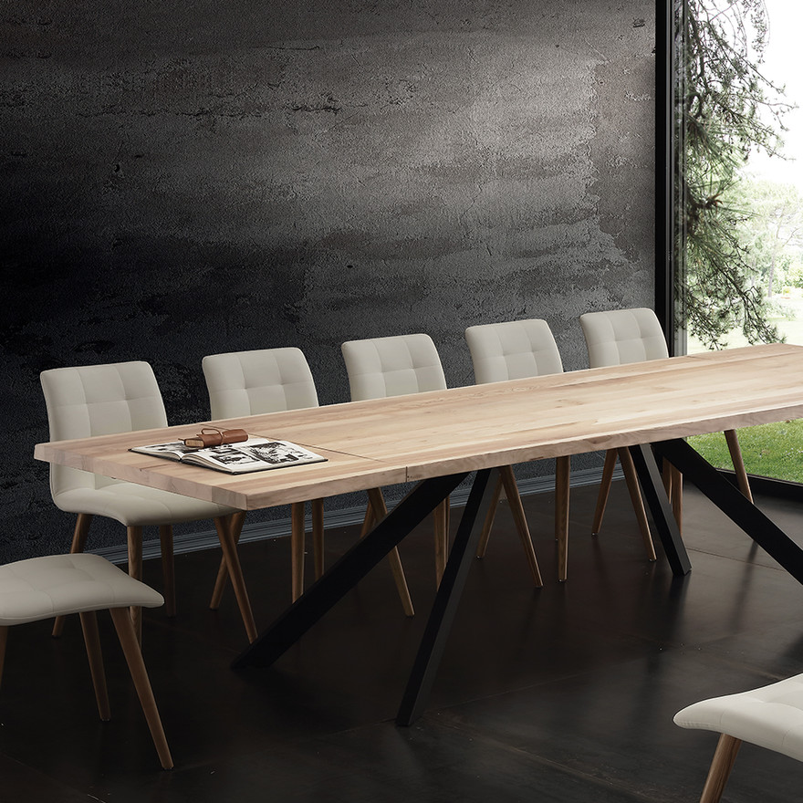 Descrizione: Tavolo con base in metallo, con piano in frassino olivato massello spazzolato naturale.